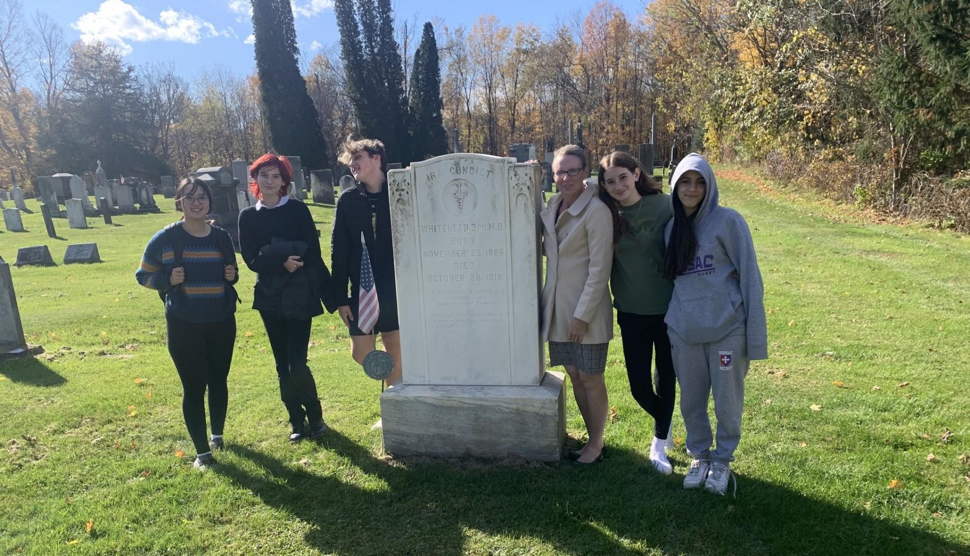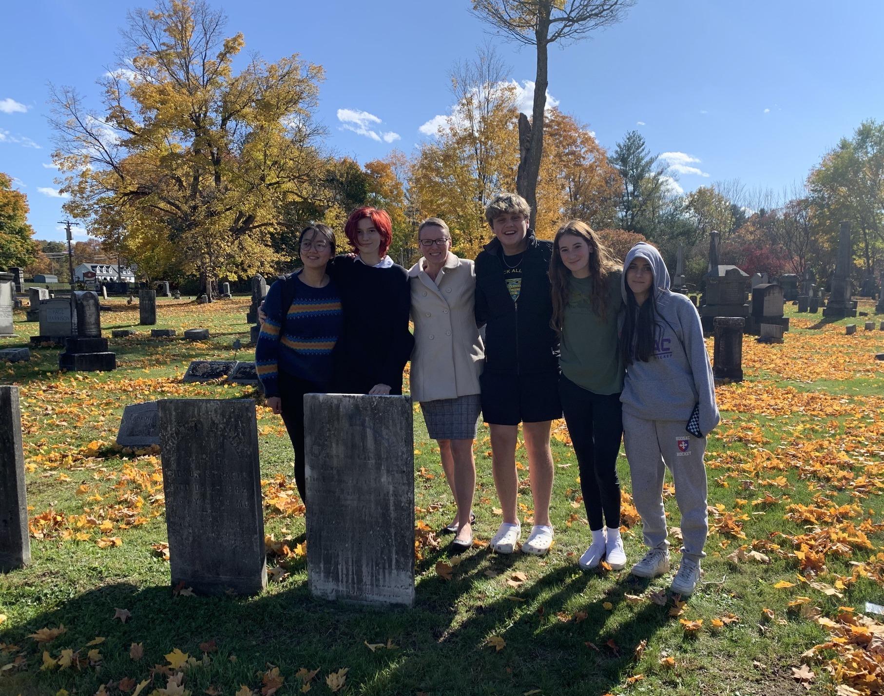 Hoosac History Club students toured three local cemeteries, visiting the graves of child Ruth Sprague, whose stone is known for its unique epitaph, the infamous and haunted graves of murderess Mary Rogers, and the final resting place of Hoosac's own physician, Dr. Ira Whitehead.